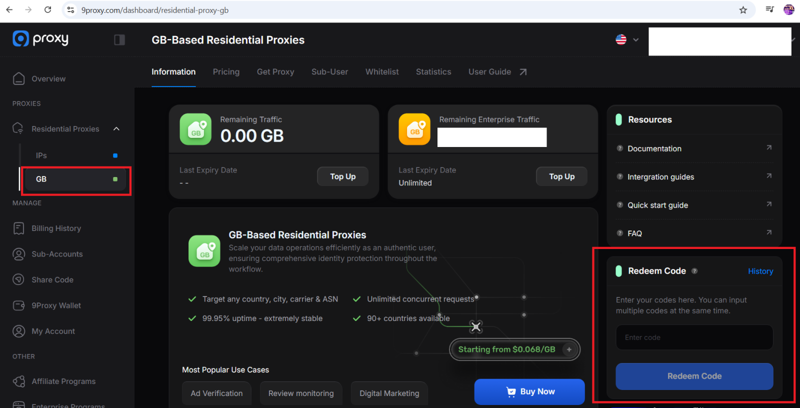 Bước 2: Vào https://9proxy.com/vi/dashboard/residential-proxy-gb