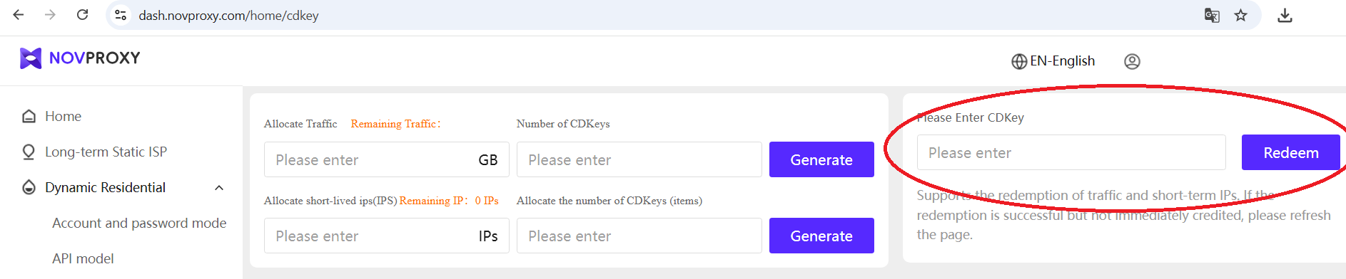 Bước 2: Vào https://dash.novproxy.com/home/cdkey