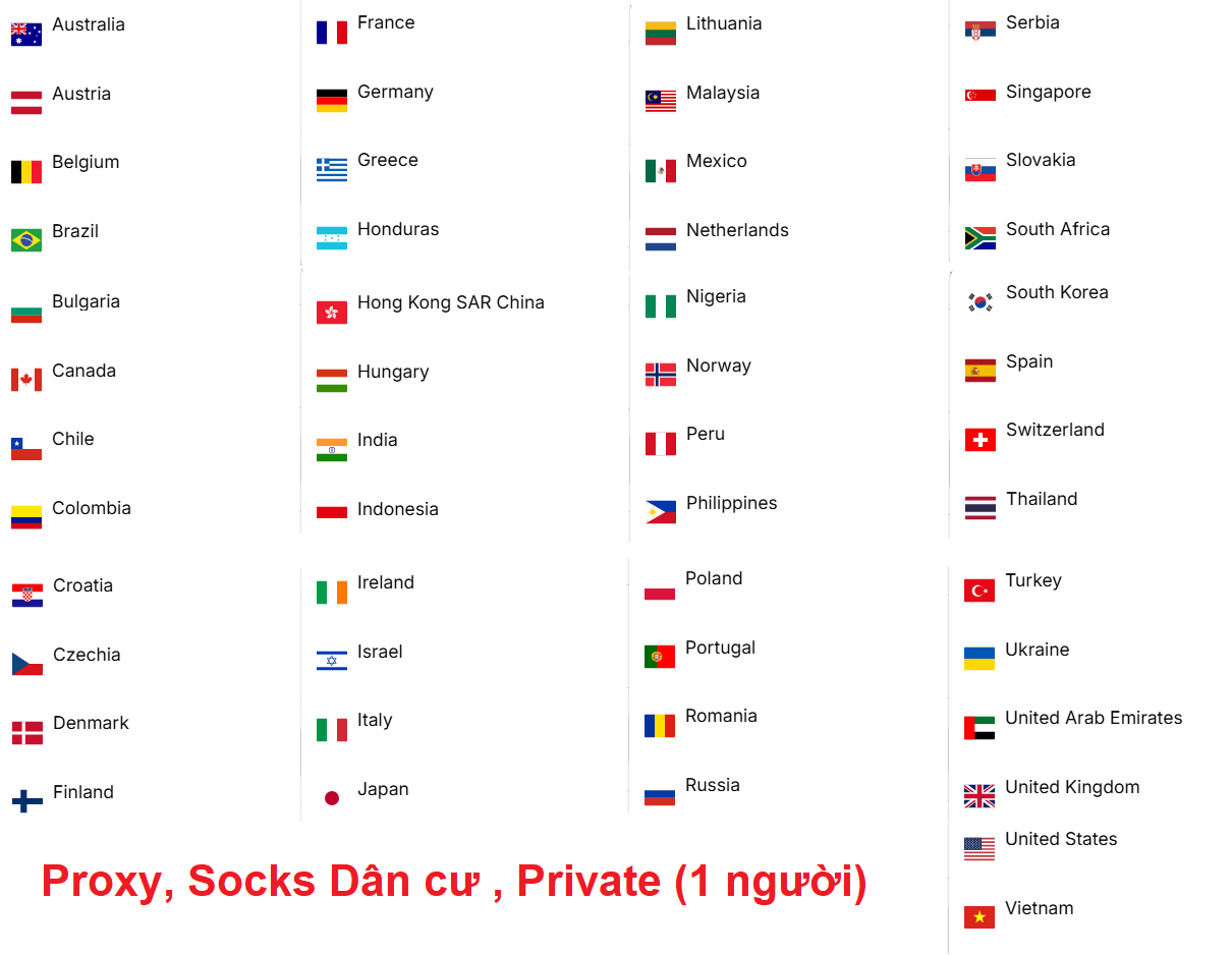 Loại Proxy: IPv4 dân cư tuỳ chọn được tất cả quốc gia (hình ảnh bên dưới)